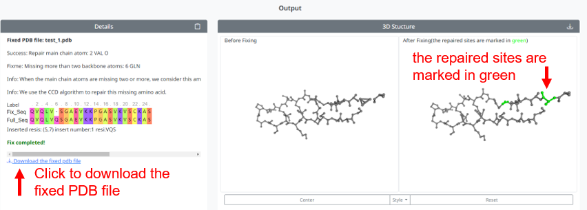 4. When the repair is complete, the page shows the details of the repair and the 3D structure of the PDB file before and after the repair. Also provide the file download after repair